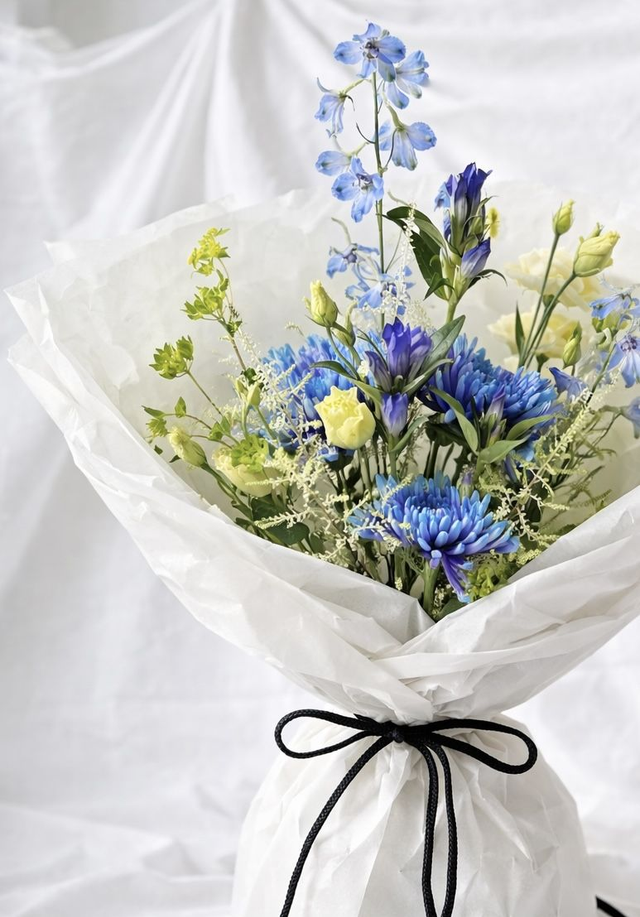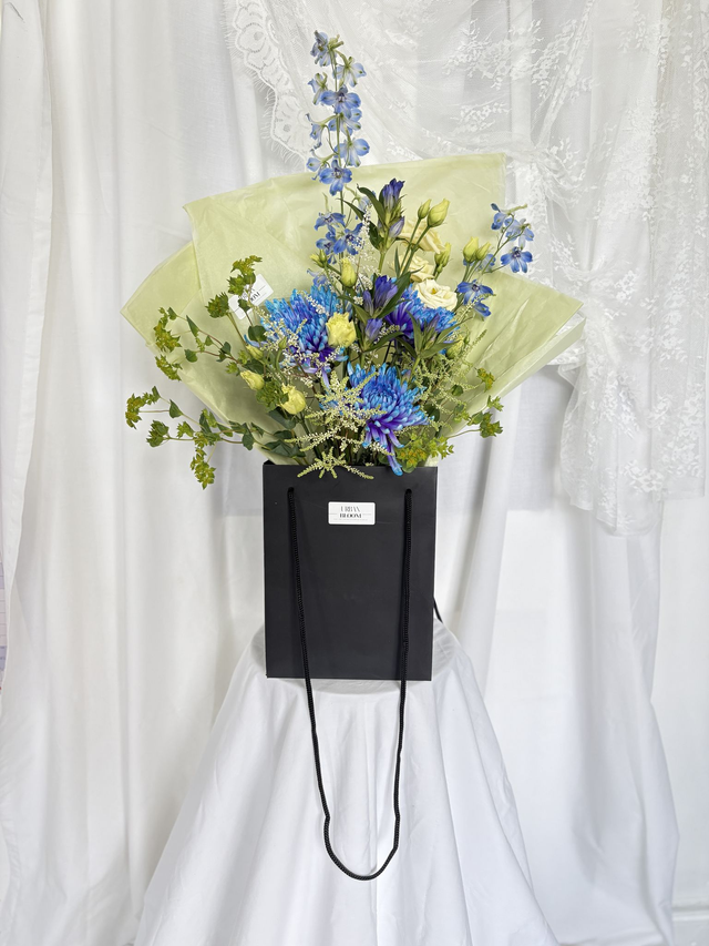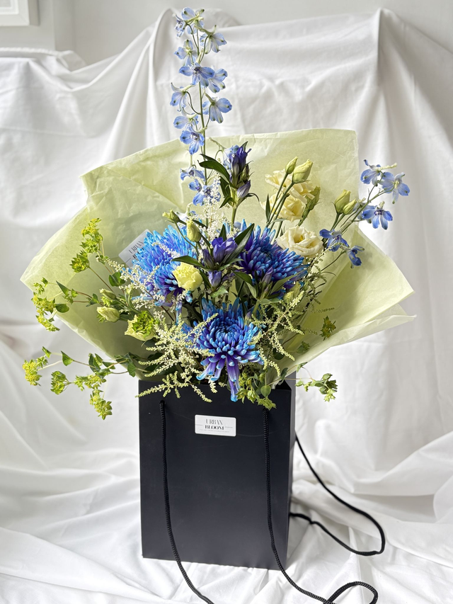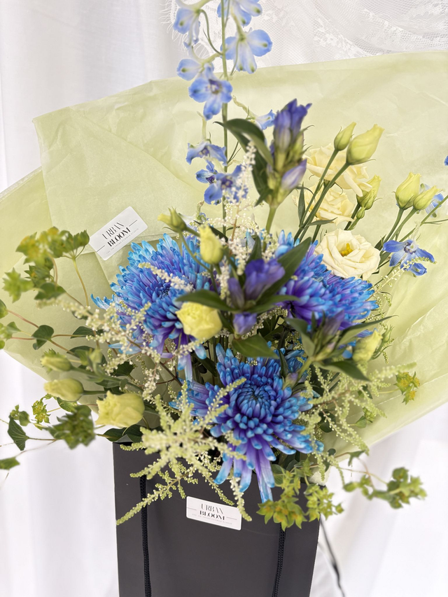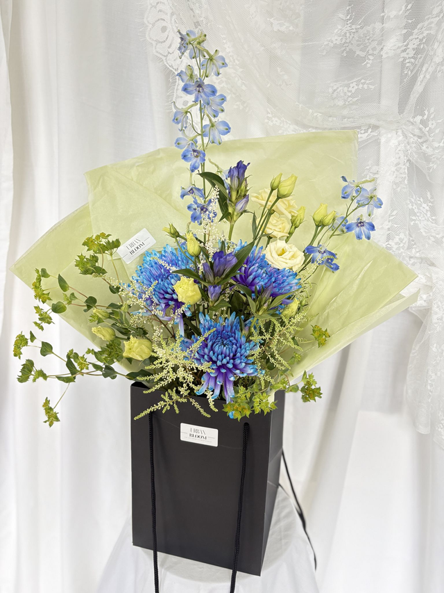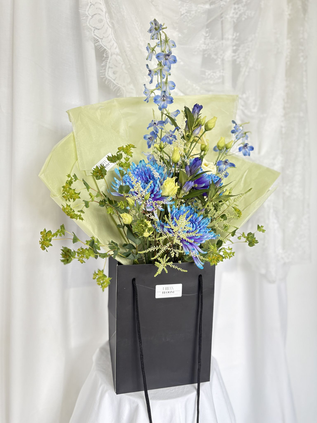 She's Electric is a statement of cobalt blue, acid lime and creamy yellow blooms, making this bouquet confident, modern and a little unexpected. Crisp Delphinium spires, electric blue chrysanthemum, sculptural lines, fresh acid greens and soft feminine lisianthus make this bouquet a true showstopper.