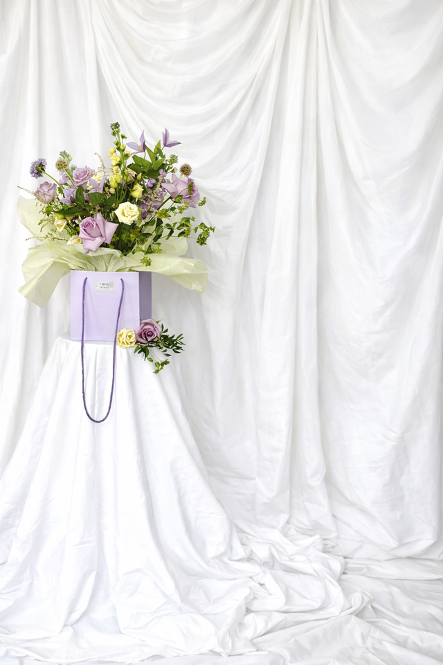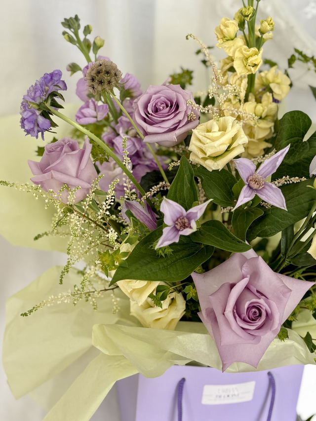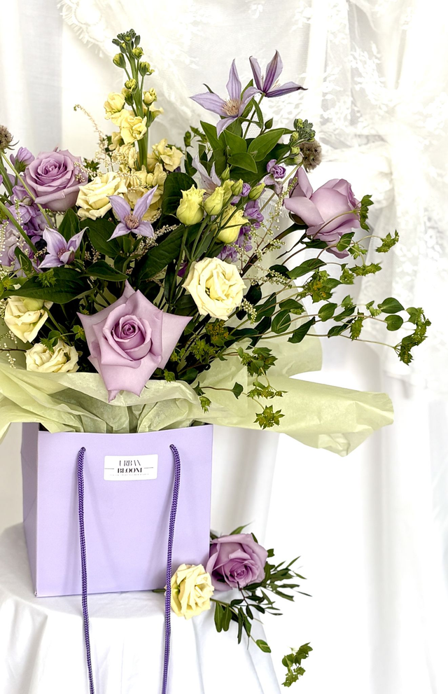 Meet Sugar Bloom — a modern pastel dream designed for the soft-hearted and style-led woman. This signature Urban Bloom arrangement is a mix lilac roses, stocks, dainty clematis and scabies, mixed with buttercream lisianthus & ivory astilbe, surrounded with fresh textured foliage, all styled in our luxury lavender gift bag for an effortlessly elevated finish.