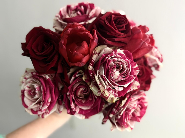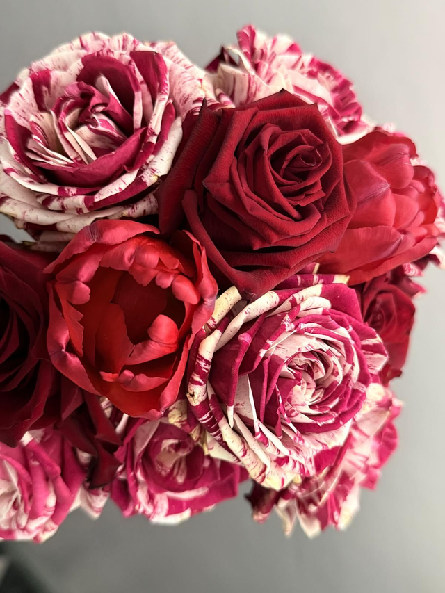 This beautiful Valentine’s bouquet celebrating the timeless symbolism of love - the Rose. Designed in a variety of shades of red, this statement bouquet has premium velvety Explorer Roses, raspberry ripple marble roses , with pops of tulips woven through, creating depth and oozing modern romance. Styled with Urban Bloom’s signature fashion-led aesthetic, this bouquet is bold, elegant and expressive — perfect to simply to say I love you. Each arrangement is individually handcrafted at our Stockport studio, making every bouquet beautifully unique :)