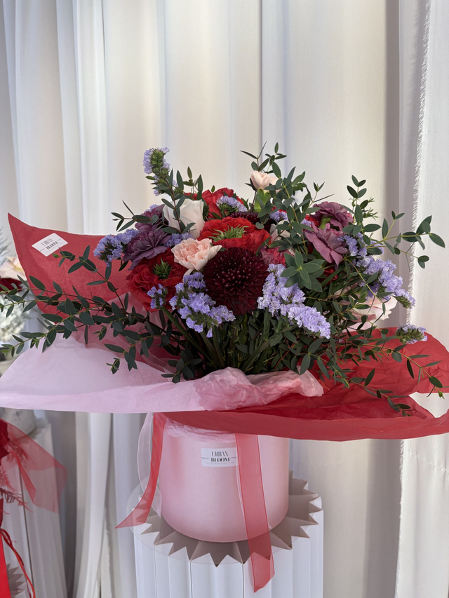 If you want a Valentine's Bouquet that makes a bold LOVE statement, then this is for you. Featuring velvety red and blush roses, including peach and lilac sculptural carnations, and soft lilac accents of statice fflower, layered & surrounded with flowing eucalyptus for a modern, editorial finish. Bold yet refined, this fashion-forward arrangement is designed for elevated Valentines gifting that's unforgettable!